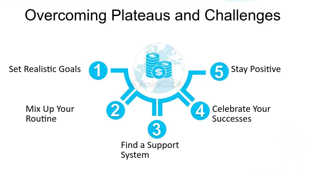 To break through plateaus, shake up your routine by changing your workout intensity or type, adjusting your calorie intake, or incorporating new foods and recipes. Stay patient and persistent, and remember that progress may be slower but is still achievable.