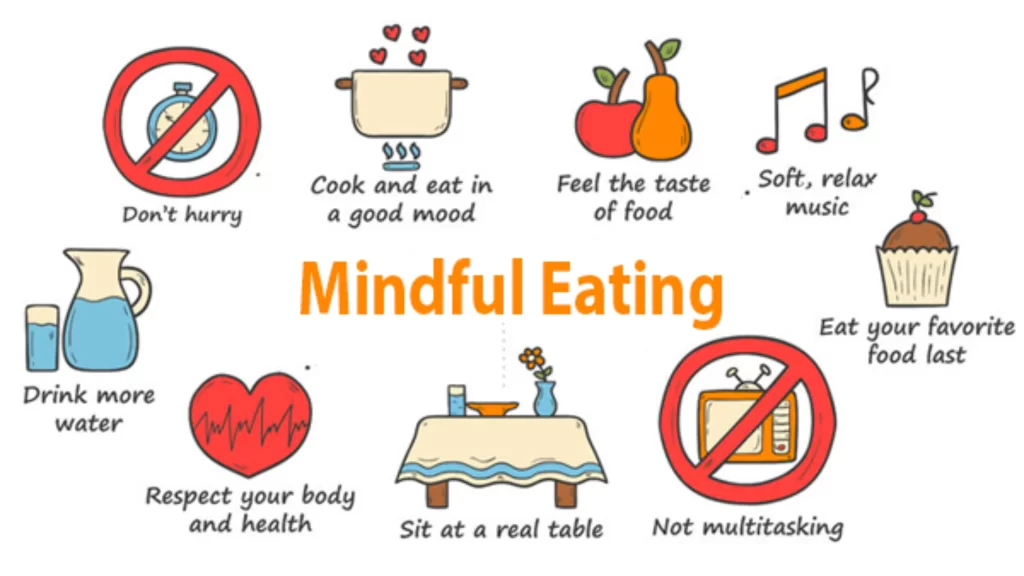 Avoid distractions like TV or smartphones while eating, chew food slowly, and take breaks between bites. Pause halfway through your meal to assess your hunger level and decide if you need more food.